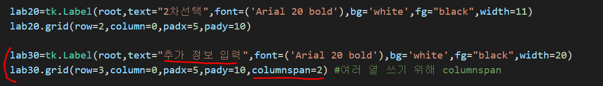 추가정보입력 이라는 라벨을 넣을 차례인데, 두 열을 쓰고 싶다. 이런 경우 라벨에 grid 메소드를 적용할 때, columnspan=2 로 입력하면 된다.